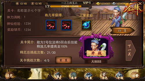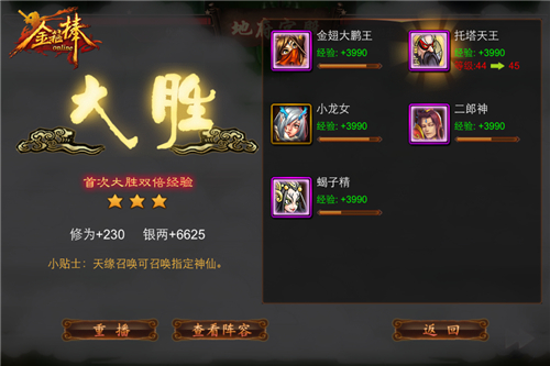 除了这些常规奖励外,《金箍棒OL》释厄副本每一关中还有额外的奖励,即首次三星通关收益双倍!释厄副本三星通关的评判标准和普通关卡一样,战斗结束后队伍所有成员的血量剩余70%及以上即可。不仅仅主角修为和神仙的经验奖励翻倍,副本掉落的材料也会相应地增加哦。满屏掉装备,简直过瘾!