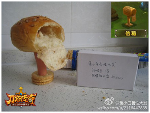 囧死了对不对!!!老婆给辛苦准备的早餐(饼干、面包、火腿肠)被做成了《刀塔传奇》里的信箱,看到这个图的时候,小冰冰内心始终在吐槽:“这可真是狂拽炫酷叼炸天啊,你这么有才你老婆知道么?不知道这位队长哥哥接下来会不会被罚跪搓衣板呢?”