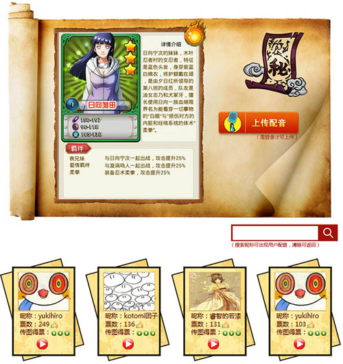 《火影大人》此次声优征集大赛共提供五个角色给大家配音,其中包括漩涡鸣人、宇智波佐助、宇智波鼬、波风水门,日向雏田,让小编意想不到的是,居然日向雏田的配音参赛选手是最多的,并且其他几位男角色也有MM配音哦!看来《火影大人》玩的MM也是非常之多哇~还玩啥微信啊,赶紧来听听美丽动人的天籁之音啊!获奖选手均可入选到“有妖气声优库”,将有机会成为有妖气御用声优。
