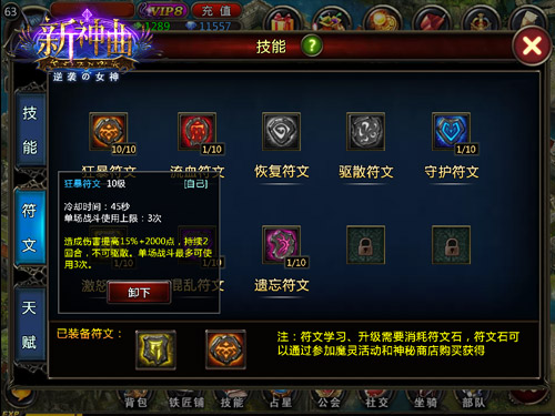 在《新神曲》中每个职业只能学习8种符文。玩家通过消耗不同符文石可学到不同的符文。玩家可根据职业、战斗特点选择不同的符文,制定不同的战斗战术。习得符文只是第一步,如果想让符文发挥到极致,还需后天培养。