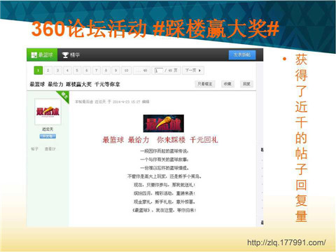 四月之中,《最篮球》在360论坛和泡椒论坛中发布了“踩楼赢大奖,千元等你拿”活动,论坛中的小伙伴们踊跃参与,积极回复,短短时间内已经有近千贴回复,其中各种对《最篮球》的祝福和建议,简直就是满满的正能量啊!