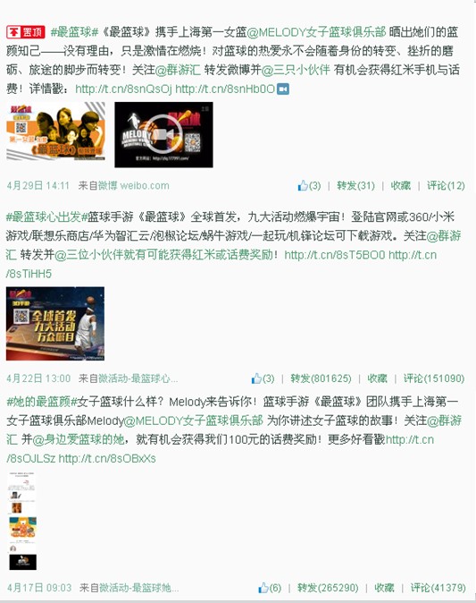 四月之中,我们在微博发起了#她的最“篮”颜#和#最篮球心出发#活动,转发量过百万,粉丝们的热情回复仿佛让我们都回到了那些年一起打篮球的热血青春。众多好礼,包括红米手机,话费充值卡等多种多样的奖品已经发送给那些幸运中奖的小伙伴们了,想要更多惊喜,请关注我们的群游汇微博。