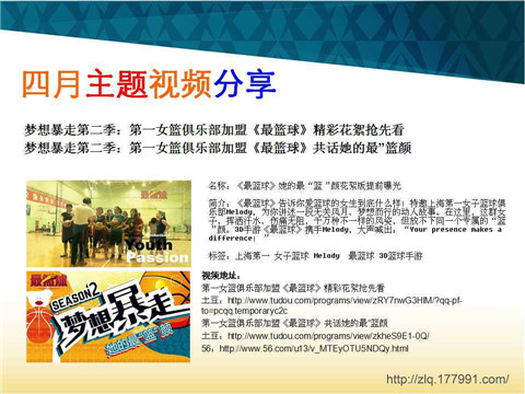 四月之中,我们携手上海第一女子篮球俱乐部Melody隆重推出精品视频——她的最“篮”颜,在官网、贴吧、微博、论坛发布之后获得粉丝们的大力拥护,为视频中这些坚强的女子而感动,为她们的篮球故事所动容,为迷茫之中的她们却依然有着对篮球的坚持而欢欣鼓舞。
