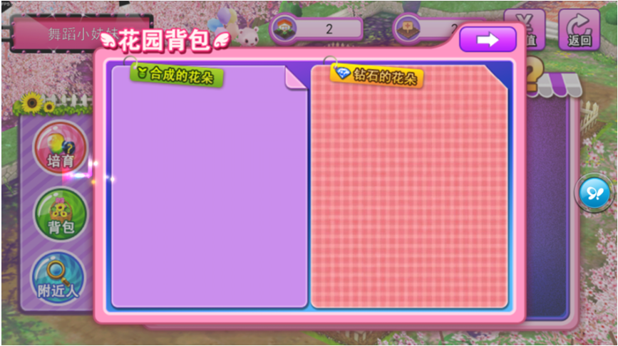 玩家在游戏中可以获得种植花卉的种子、化肥、宝石。在培育处依据已有的花卉素材培育鲜花。培育未成熟的花卉会有倒计时显示,成熟的花卉就可以收入背包中啦!收入囊中的花卉就可以赠给心上人了,用于彼此增加魅力值。不同的花卉获取的魅力值是不同的。同时,你为好友们送出鲜花后,还将为他们带来福利。当你在商场购买商品时可以享受打折优惠,在魅力排行榜获得奖励等。越是互动的多,相关的福利也会不断的丰厚起来。