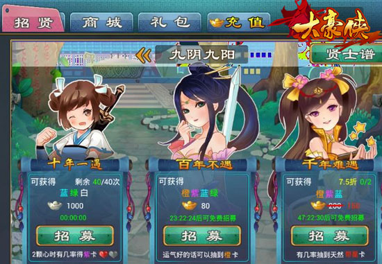 初入江湖没有猛将谋臣前来投靠,深感愈加寸步难行。不用担心,在《大豪侠》游戏中,玩家只需要花费银两或元宝即可招募侠客。侠客通过颜色一共分为橙、紫、蓝、绿、白五种品阶,橙色品阶最高,白色品阶最低。银两招募有机会获得蓝侠客,绿侠客,白侠客。而80元宝招募有机会获得橙侠客,紫侠客,蓝侠客,绿侠客。更进一级的200元宝招募将有机会获得带星级的橙侠客、带星级的紫侠客以及带星级的蓝侠客。