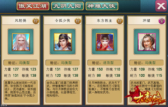 《大豪侠》取材自经典古龙金庸武侠小说,从东方教主无敌天下,到东邪西毒南帝北丐中神通五绝争锋,再到小李飞刀楚留香,侠客阵容华丽庞大,超百种江湖侠客任你挑选。那些仿佛只存在于经典之中的人物,都将降临乱世江湖,协助你威震四方称霸武林!