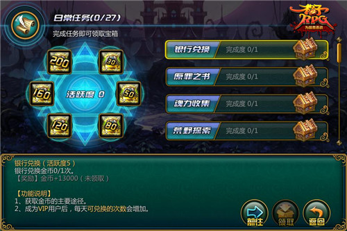玩过《格子RPG》的玩家都知道,此前的四大任务虽然奖励颇丰,却非常死板,每做完一大任务里的所有小任务才能获得奖励,很多玩家由于时间或者各种原因没有做完,就无法获得奖励。在新版本中,为了能让小恶魔们获得更多的奖励与更多的锻炼机会,《格子RPG》全面改动日常任务,将四大任务完全分割开来,并新增数个小任务,每完成一个小任务都可以获得奖励,摆脱“拿不到奖”的烦恼,同时增设活跃度,每完成一个活跃值,就可以获得一次性大奖!