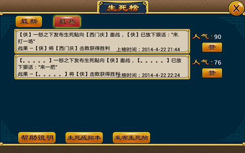 无法了解的恩怨只能一决生死,《暴走江湖》开放了独特的“生死贴”玩法,人们可以给指定的对手“发布生死贴”,如果担忧对手不接贴还可以附上决战宣言,对手接贴后便会展开旷日持久的生死决战。虽然是游戏世界,但是生死战的惩罚也极为严重,接贴方无论是避战还是战斗失败等级都会降低1级。发帖方胜利除了可以登上生死榜外,还可发布拓本,在全系统炫耀战绩!