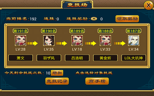 游戏中纷争不断的莫过于竞技场。竞技场为排行PVP玩法,人们可以挑战当前界面显示比自己高5名的对手,挑战胜利则会取代对方的排名,而且还可以累积获得连胜次数。相对于高高在上的排名,连胜奖励、排名前10的荣誉值、荣誉币、金钱等极为丰厚的奖励是不是也会让武林豪杰为之疯狂呢?