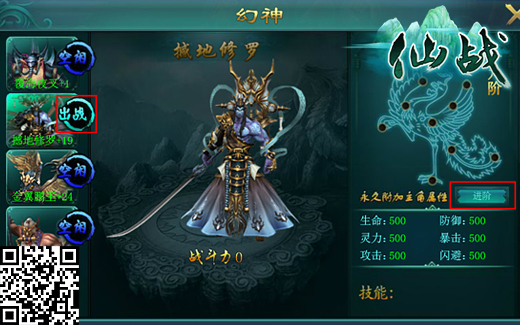 在《仙战》里等级达到51级的玩家可以开启幻神功能,通过“变强”中的“幻神”按钮即可开启幻神面板,预览首批5位登场魔将的外形。除了各具特色并且都霸气十足的外形之外,每位魔将都有自己的专属技能,玩家可以按自己的需求变身成喜欢的魔将。