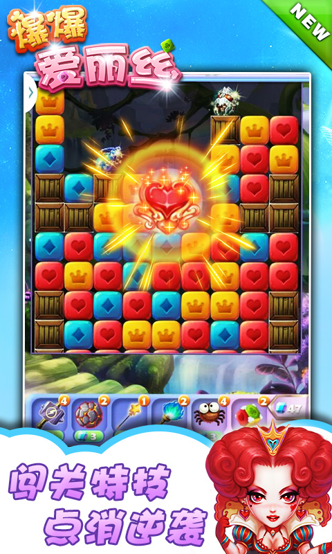 《爆爆爱丽丝》之所以被称为指尖上的点消巨作,不仅源于经典畅销童话作品全部植入,更运用原著中爱丽丝、兔子先生、红桃皇后等经典角色,独创魔方消除、魔杖施法、红桃炸弹等角色特技,此外还独特的将雷神之锤、熔岩火球、星之魔杖、迷之魔方、噬网蜘蛛、苍焰火把等消除道具融入其中,带领全线玩家完爆星星国王,实现最疯狂的点消逆袭!