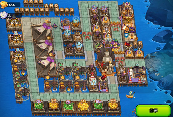 对于长蛇阵,敌人如若想要进攻,就势必要走过一段被挨打的路程,这里损失也会较大。还有我们看到长蛇也不是都在一边,而上下两边分错排列箭塔。这样的话,敌人先使用飓风,船长也会在最先要遇到的塔下停下来,而不需要走过一段只能挨打的过程。其实长蛇阵也分卖老船和不卖老船,但是我觉得不卖老船会更好一点,因为长蛇限制了你无法在老船旁边摆下较强的火力。