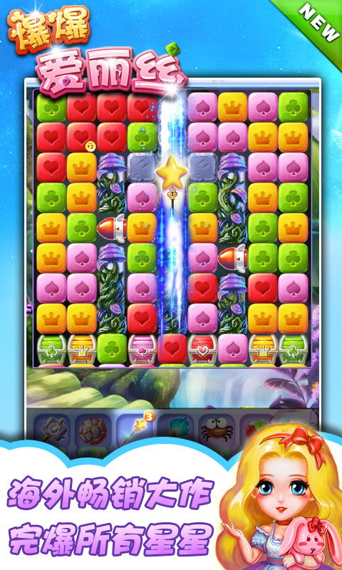 点消巨作《爆爆爱丽丝》拥有完爆POPSTAR的高端闯关玩法,收集宝藏、密室逃脱、解除藤蔓等20余种惊险刺激的闯关模式,挑战玩家点消极限!100多关丰富多彩的闯关关卡,让你尽享畅爽无比的点消乐趣!魔方消除、魔杖施法、红桃炸弹等主角特技,带你一起回味原版童话的经典剧情!此外还独特的将雷神之锤、熔岩火球、星之魔杖、迷之魔方、噬网蜘蛛、苍焰火把等消除道具融入其中,带领全线玩家完爆星星国王,实现最疯狂的点消逆袭!