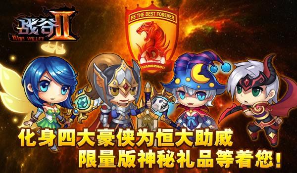2014广州恒大中超联赛如火如荼地激烈展开,国足各区域众星云集,谁将问鼎!相信《战谷Ⅱ》的众多玩家里一定也有不少恒大忠实的球迷吧!在《战谷Ⅱ》首发来临之际,为了能让您在莱昂大陆上也过把足球瘾,现邀您化身四大勇士,赋予恒大神奇力量为恒大加油助威!正版恒大球衣,正版恒大足球,限量版私家订制神秘礼品在召唤它的主人!更有人人都想要的恒大门票!!!