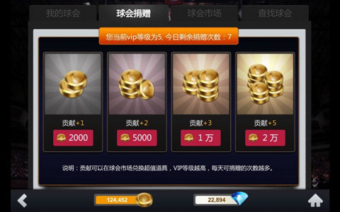 身为球会的一员,当你想为自己的球队做出贡献之时,可以为球队捐献金币,你可以与你的球队共成长,你也在捐献金币后会获得一定量的贡献值。