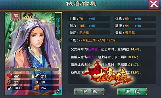 《大豪侠》不仅制作了原著中魔教圣姑任盈盈形象,而且同样是古灵精怪,同样是貌若天仙,游戏中不仅让痴迷武侠原著和圣姑美貌的你可以对圣姑膜拜一番,而且还能与她并肩作战,一同主持正义!在游戏初期玩家就有机会接触到她,并且一路协助玩家进行修炼,无论在战斗中还是日常休闲她都是你队伍中的得力干将!
