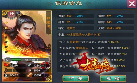不得不说《大豪侠》中还有一个经典灵魂人物大侠杨过,说起他你一定还记得他自小就为孤儿,好不容易被郭靖一家收养却受尽欺负,最后遇见好心的小龙女收留并将其抚养长大还传授一身武艺,最后与其师傅小龙女生情,却又阴差阳错产生误会相互思念等待15年才再次冰释前嫌走在一起!在游戏中大侠杨过同样是一身正气,儿女情长,无论在哪里他心里始终最重要的还是小龙女!