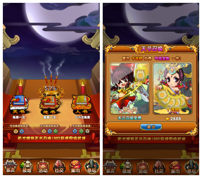 通过combo触发的武将技能在战斗中常常发挥决定性作用,所以一张强大的武将卡牌是玩家称霸游戏的必备之物。玩家可以在“祭坛”中抽取卡牌,“祭坛”分为天书、地书和人书,分别对应不同品质的武将,每天玩家都会获得7次免费的抽卡机会。天书是出现强力武将几率最高的祭坛,玩家可以自由选择抽一次或连抽十次,十连抽不仅能获得武将卡牌更有几率获得高级宝物!如果你是第一次进行十连抽,那么必然可以额外获得一件甲级宝物!