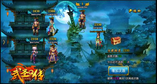 决战之巅是《武圣Q传》的核心玩法之一,以月夜下层叠的古楼和林木为背景,描述了一个萧瑟的战斗场景。希望能给玩家一种别样的战斗情怀。在这里,玩家可以和同一等级的人进行PK,PK胜利后获得铜币奖励,排名也会随之上升。想要早日领略登顶风光。不妨在加强战斗力的时候,和这些高手们切磋。