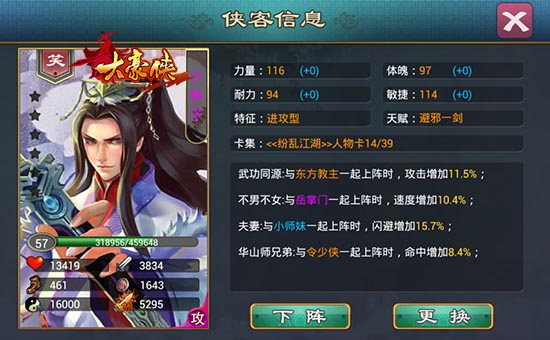 俗话说团结就是力量,侠客之间互相合作更有意想不到的效果!《大豪侠》中的侠客天生带有固定的命数,即侠客与另外某固定侠客一起上阵作战时,获得更高的属性加成,可获得意外的攻击,防御,速度,生命,命中,免伤,闪避等属性加成。