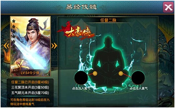 玩家角色等级达到18级开放易筋玩,在易筋中注入真气,可提高侠客的属性。侠客到达40级,可在易筋中注入真气打通经脉,注入不同种类的真气可提高侠客对应不同的属性。随着等级的提升还可打通任督二脉、三花聚顶、五气朝元更多的武功秘籍更可轻松学成!