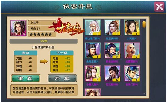 游戏中每个品质的侠客都可以进行升星,侠客星级越高,属性加成越高哦。只需要使用同品阶的侠客、同品阶的侠客碎片、升星丹可进行侠客升星,吞噬同种类的侠客还可获得更多经验,吞噬星级越高的侠客获得经验越多。