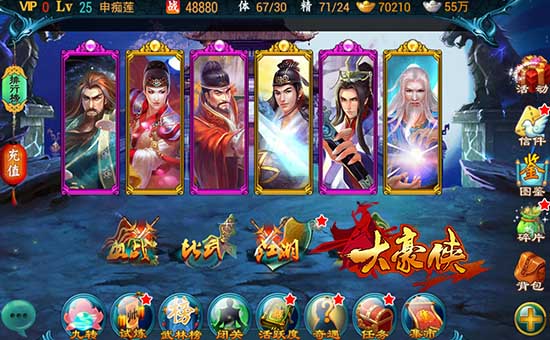 进入游戏后从主界面上点击侠客槽就可看到各类英雄侠客,即可让你进入英雄最全的武侠世界。游戏中每个侠客养成轻松简单,侠客的等级提升可直接通过关卡战斗、比武战斗、完成任务可获得侠客经验获得的经验值提升,并且侠客属性随着侠客等级的提升而自然提升,属性值越高,侠客越强。
