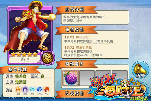 《激斗海贼王》由世纪鹤图开发并运营,是一部卡牌RPG手游大作,游戏剧情紧跟原作,经典人物悉数登场,各职业、装备、技能、恶魔果实、料理等元素完美呈现,更有功能新奇的黄金梅丽号伴你起航,劲爆的战斗画面,爽快的点划搓招,为玩家带来最震撼的伟大航路之旅。