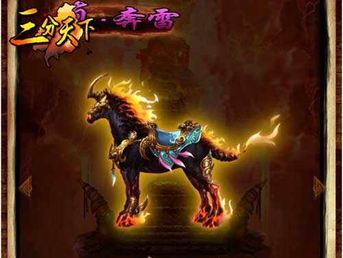 奔雷,《三分天下》中三大名马之一,虽然并未在历史当中出现,但并不影响其在战斗时给玩家提供的强大的辅助能力。传说当中此马乘云而奔,迅疾若雷,头顶炎角,脚踏烈焰,一身白色鬃毛,鬃尾金黄,能夜行万里而足不溅土,是名副其实的坐骑神兽。与其他两大坐骑属性相同,奔雷同样可以赋予玩家高额的战法攻击加成,是法攻武将必备的良驹。
