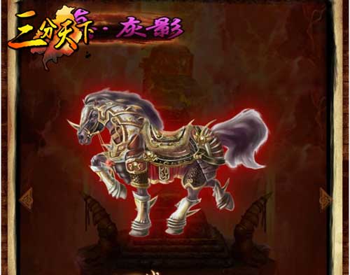 灰影,三国时期魏国名将张辽的坐骑,后有人称“负问天,胯灰影,威震逍遥津”,张辽在此战中亲率八百步卒逆袭孙权大军,胯下坐骑灰影绝对居功甚伟。在游戏中,灰影坐骑拥有和赤兔马同等的特效,除了可以增加玩家的各项属性外还可以给玩家额外增加390点的战法攻击加成。