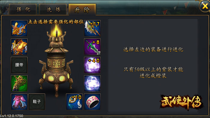 50级以上的紫装,可以通过消耗同部位同等级的紫装+若干的升级卷轴来进行升级升阶。变成橙装。紫装可以通过精英副本获得,付费玩家还可以通过额外的翻牌获得更多紫装;卷轴是较为稀有的材料,通过新的噩梦副本来购买获得。橙装拥有1个主属性与6个附加属性,主属性上限都比紫装高。即使与紫装处于同一个区间内,属性值也会高于紫装。绝对是江湖行走、居家必备的上乘武器!