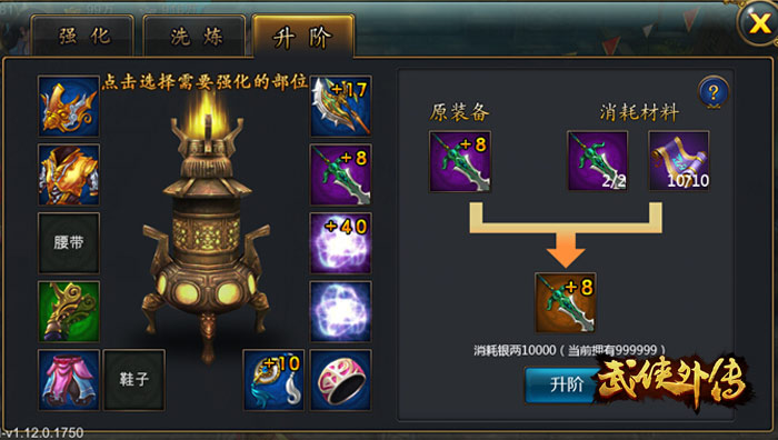 升阶界面开启后,玩家选择左边的一件50级以上紫装装备,配比所需消耗的升阶材料,消耗一定的银两,便可顺利升阶。升阶前可预览到升阶后的装备。使用消耗的材料装备,如果是曾经强化过的,按照出售的规则将强化石与银两返还给玩家。所以玩家大可以放心强化升阶!