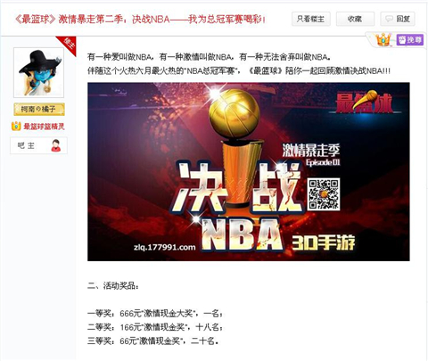 最篮球贴吧最近活动不断,精彩连连,包括我为总冠军喝彩、最篮球暴走季番外篇视频:爱要大声说出和世界狂欢等活动,《最篮球》也在巨会玩、360手游最篮球专区和可可游戏中心发布了一系列的有奖活动,小伙伴们快快去参加拿大奖吧!