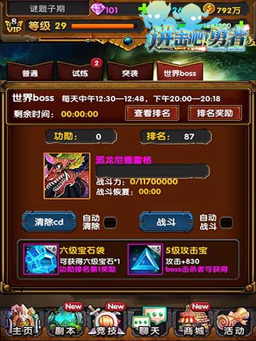进入《进击吧!勇者》主页-世界BOSS界面,就能看到当前被挑战的世界BOSS信息,最吸引我们注意的,当然就是丰厚的“排名奖励”了。