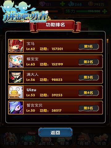 当征讨世界BOSS达到一定次数后,《进击吧!勇者》就会在功勋排名上显示排位。同样战斗力的情况下,参加征讨BOSS次数越多功勋值就会越高。