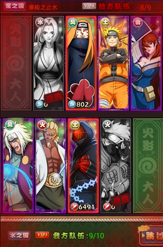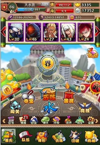 我们最初的设计理念是让玩家一进入游戏就能够感受到扑鼻而来的火影气息,因此我们选取了各国的著名建筑为背景,火之国的历代雕像、风之国的沙漠奇观等。最上方,我们决定放已有忍者小头像,因为这样既方便玩家查看阵型情况,也能增加火影粉丝的亲切感。