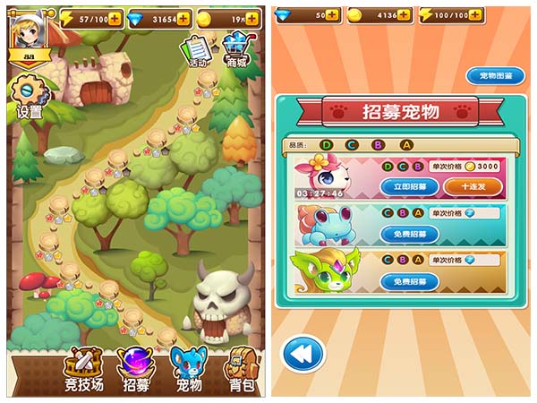 首先宠物的获得方式可以通过招募和游戏中获得宠物蛋这两种方式来获取。在游戏主界面中下方可以看到招募按钮,点击进入后玩家可以选择不同的资源来招募宠物,三项招募所需的资源种类和数量有所不同。而关卡中获得的宠物蛋则可以开出所有品质的宠物。宠物品质由强到弱依次为A、B、C、D、E五个级别,当然,即使同一品质的宠物也有强弱之分,该区别玩家可以根据宠物的星级来判断。