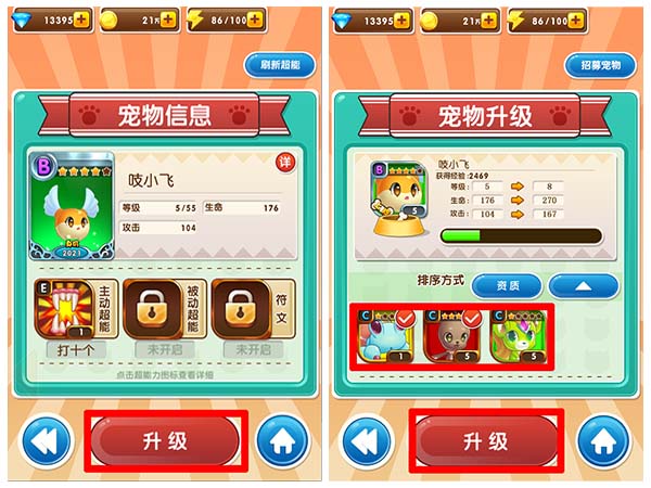当感觉宠物不再那么给力时可以为其升级。进入宠物信息界面后便可看到下方的升级按钮,点击进入。点选界面下方宠物,被选中的宠物会用钩标注出来,选定需要的宠物后再点击升级按钮,即可为宠物升级。
