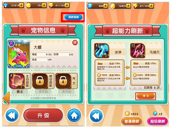 每个宠物都拥有超能,玩家如果觉得自己的宠物超能不是自己所希望的,不必担心,因为你可以为自己心怡的宠物刷新超能哦。首先还是需要玩家先进入宠物信息界面,然后点击右上角的刷新超能;玩家可以选择金币或钻石来刷新超能,当出现玩家所希望的超能时,点击右下角的学习按钮即可让宠物获得新的超能。