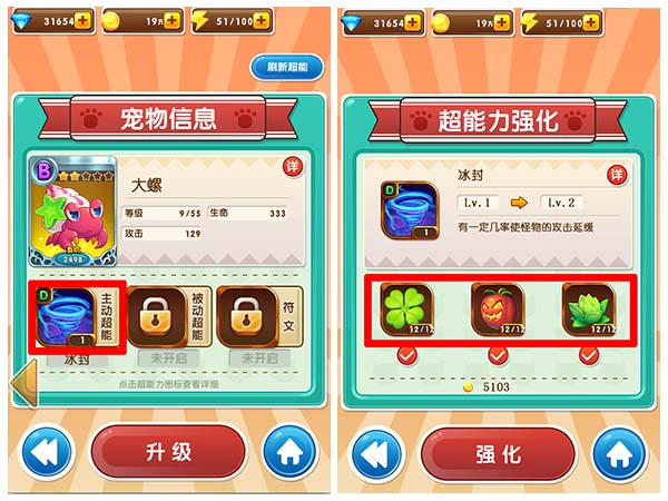 觉得喜欢的超能还不够强力?没关系,你还可以进行超能强化。在宠物信息界面中点击需要强化的超能。超能强化时需要资源,资源可以通过副本获得,但玩家也可以使用钻石直接购买资源。强化后的超能理所当然的会更加强力、特效更加持久啦。