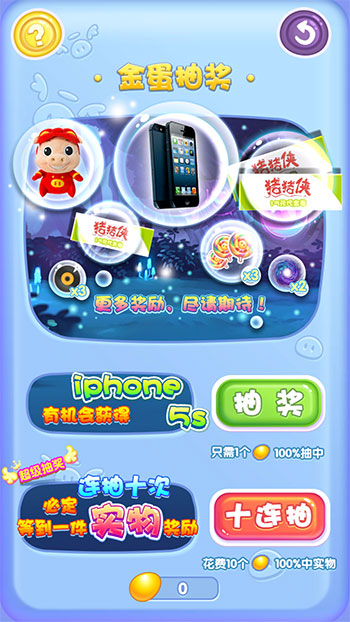 无周边不游戏,11Game《猪猪侠之勇闯巨人岛》还给你一个触手可及的福利。游戏中内置的在线实体抽奖玩法,与动画周边官方网店无缝对接,使用金蛋抽取到的猪猪侠代金券、玩具公仔、抱枕...都可通过“猪猪侠”官方天猫旗舰店一秒兑换。而超级大奖苹果5S,以及众多的游戏道具,更是将手机玩家的实惠释放到最大化,各位猪猪侠的忠粉们,你们见过这样大手笔的手机游戏吗?