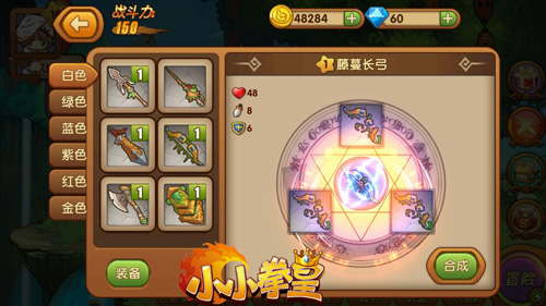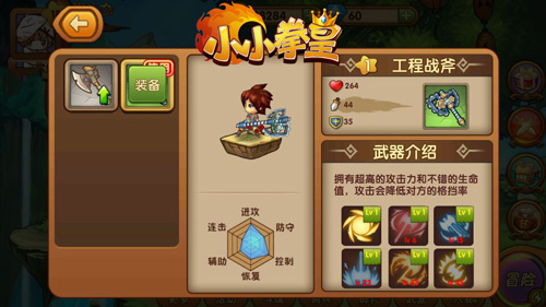 《小小拳皇》新版武器系统将游戏原本的武器单独升级变成了装备栏升级,从而使得玩家在武器培养上付诸的精力大大降低,效率大大增高,任何武器只要放到装备栏,等级就会立刻于装备栏等级对应,属性也是直接提升到相应等级,玩家们再也不用担心自己累得半死不活打出来那点钱还不够升级装备了,简单实用的设计简直就是业界良心!