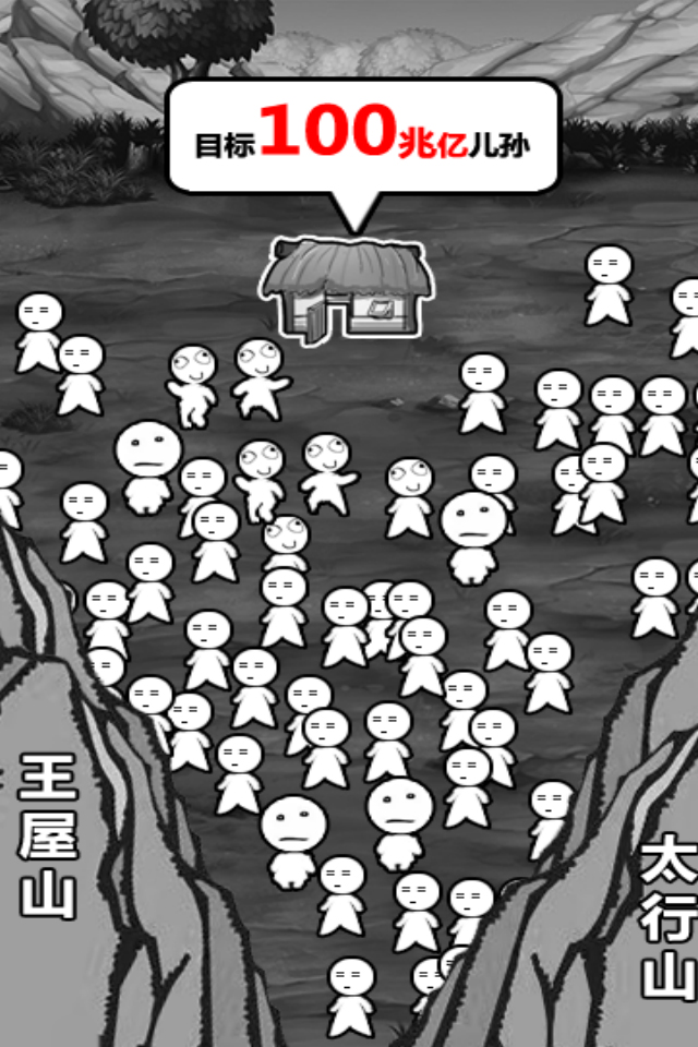 在游戏初期,玩家将通过不断的点击愚公的茅草屋,来生育儿孙,不过在不停的点击屏幕生孩子的同时要需要一些思考,比如如何在每秒手动生子的同时让子子结合从而自行“繁殖”后代,玩家需要通过献祭一定数量的儿孙解锁更高级别的功能,比如“草丛”,能大量提高儿孙的自动产出而非纯手动。游戏充分提现了愚公子子孙孙无穷匮的观点,当解锁到“超次元航母”“时光隧道”这些跨时代功能时,你的后代讲以亿为单位来计数,这时候,连女娲都要下凡帮你生孩子啦!而你的目的也早已从搬走大山,变成了征服宇宙……这个故事告诉我们,持之以恒是多么重要。