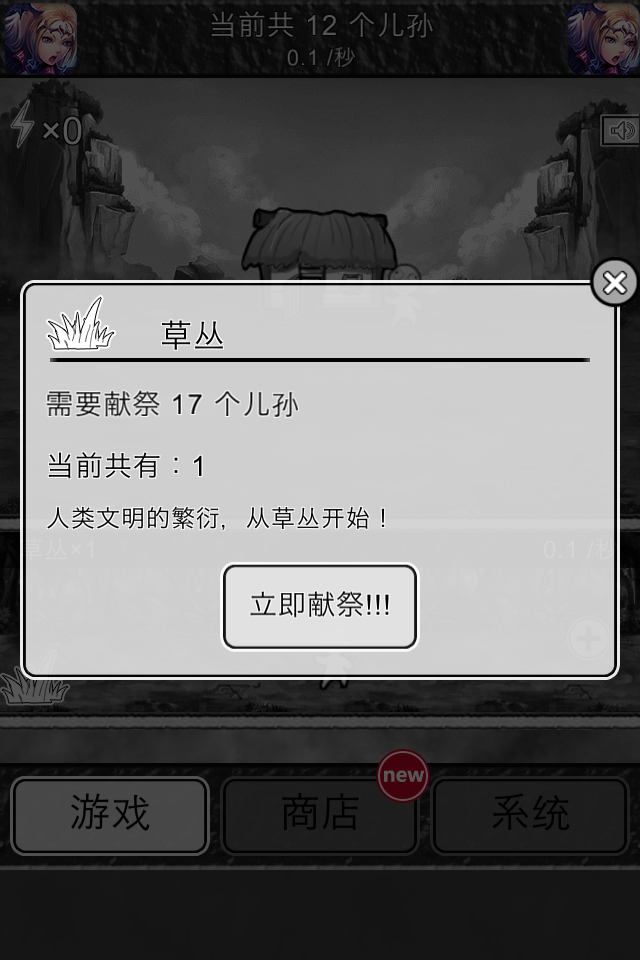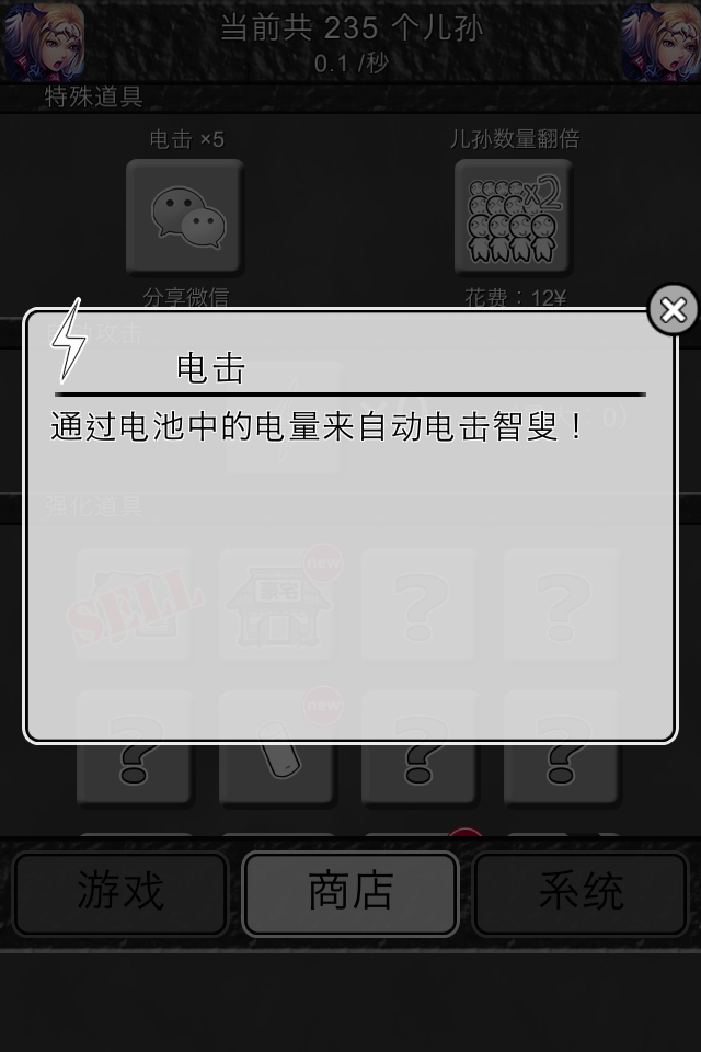 这是一个励志的游戏,也是一个逆袭的游戏。作为嘲笑愚公的智者,智叟在游戏中讲扮演一个破坏“生孩子”大计的坏蛋。每当你生一定数量子孙,或者你正在进行生育动作时,他都会不合时宜的出现,并且对你的儿孙造成毁灭性打击。前期在你只有几万的儿孙,他的破坏效果尚不明显,到了中期你有了几亿几百亿的儿孙时,那么愚公的杀伤力同样是以为单位计算的。不过不用担心,对付智叟其实很简单,你只需要在他出现时,轻轻点击,就可以制造电流将他赶跑,或者直接去商店献祭儿孙做出电池自动对抗入侵者。