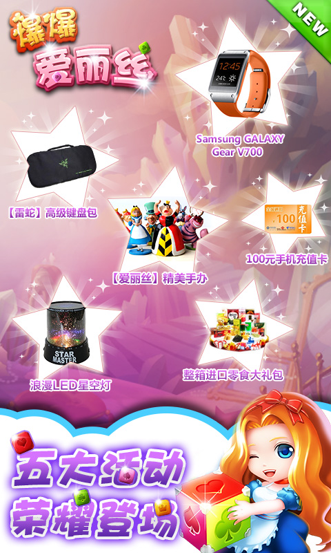 既然要完爆POPSTAR,闯关必不可少!《爆爆爱丽丝》闯关20余种模式、100多关闯关关卡足以完爆星星,剩下的就看你的啦!7月4日起,玩家将《爆爆爱丽丝》完整通关或者全三星完整通关截图发布至官方微信,就有机会获得浪漫星空灯、豪华进口零食!此外,这些发送通关截图的玩家还将有机会获得三星Galaxy Gear 智能腕表哦!豪礼不容错过,详情请关注官方微信(baijuzi520)!