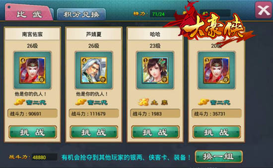 有时候勇气比实力更值得被称颂,只要进入武林榜的英雄都是武林佼佼者!《大豪侠》对武林勇士当然有丰厚奖励,每个英雄拥有一个小时倒计时的武林榜奖励,只要倒计时时间结束,就可领取海量经验奖励。自己主动挑战对方获胜后,不光可替代对方的排名,获得对方身上的奖励,声望,或经验,或元宝,或银两。但是当自己被其他玩家挑战,其他玩家获胜时,自己身上所有的奖励与排名也将被夺走哦,但是如果对方武功不及你,对方战败时,自己就会保住奖励与排名,毫无损失哦!