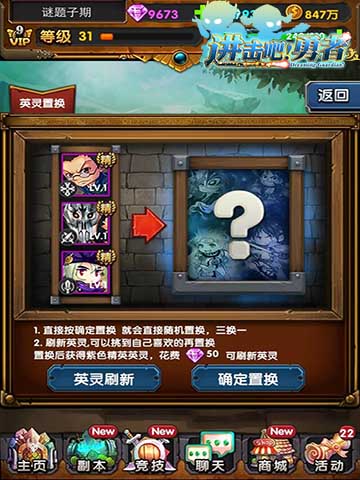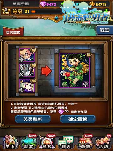 玩家在《进击吧!勇者》选择好要进行融合置换的英灵后,可以直接点击“确定置换”,也可以花费50钻石来刷新想要置换的英灵。该功能是三换一,因此建议玩家将自己重复的的英灵来进行置换,既能满足收集瘾,也能获取最大的战力提升。
