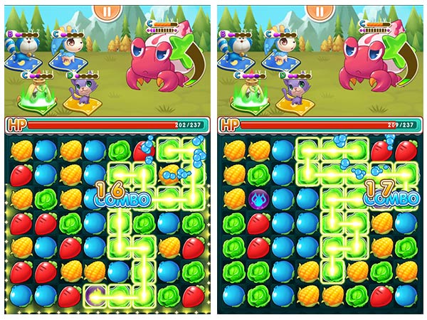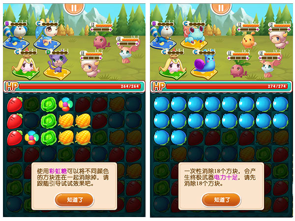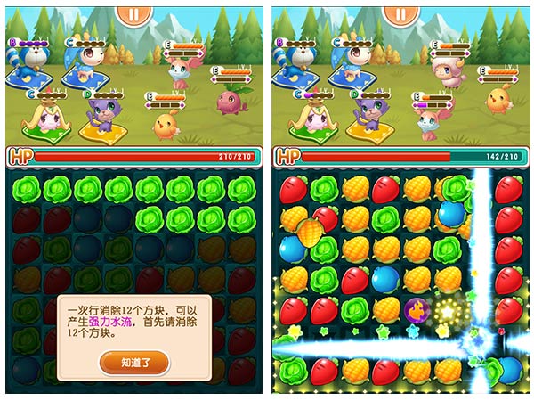 一笔划下的蔬菜越多宠物们的回馈越好,一次性消除6个方块就有爆炸道具产生,12个方块的“强力水流”不仅强力,还可以灭火哦。特别是18个方块的终极道具“电力十足”,同类全消除能让你充分享受到大杀四方的无边快感。