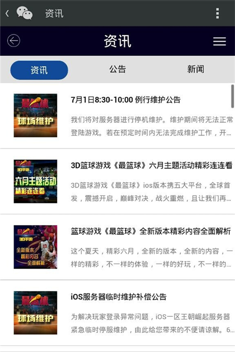 在美观完善的首页外,各链接版块页面简洁大方,内容清晰明确。资讯和活动页面可查看最新与往期《最篮球》游戏公告、游戏新闻、游戏攻略与缤纷活动。图文并茂,让你及时紧跟《最篮球》动态,不错过任何一篇新闻公告,不错过任何一场活动奖励!