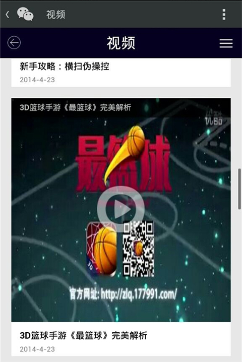 图文之外更要有声有色。进入视频页面更可直接观看《最篮球》往期与最新的游戏视频:《梦想暴走》第一季、团队成员祝福、新手攻略之横扫伪操控、《最篮球》陪你嗨翻NBA……眼花缭乱,视觉上带你领略3D篮球游戏《最篮球》的最3D、最操控、最谋略、最激情、最荣耀,让你畅享比NBA更篮球的篮球世界。